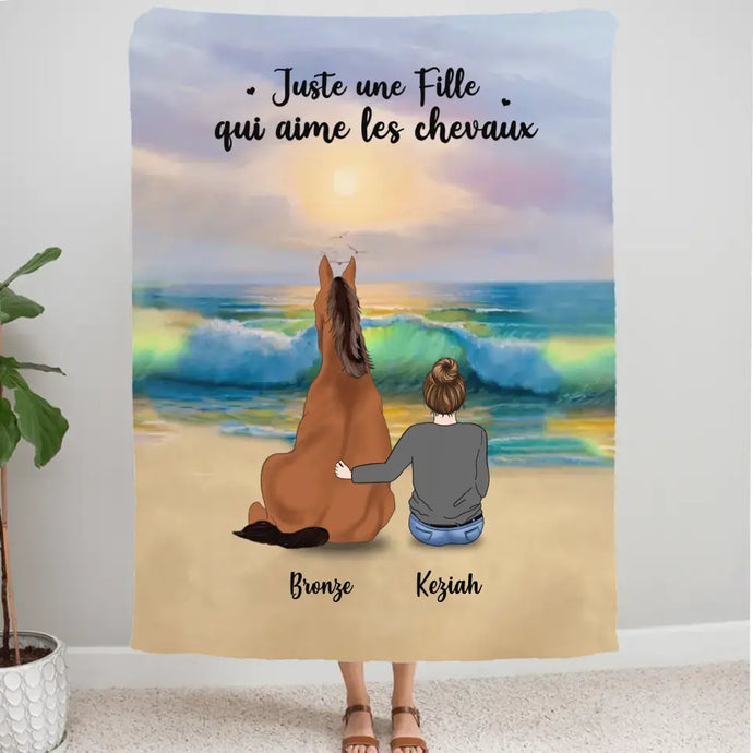 Couverture personnalisés, Plaid en polaire Cadeau Pour Maman cheval, Jusqu'à 2 chevaux, fille avec cheval sur la plage