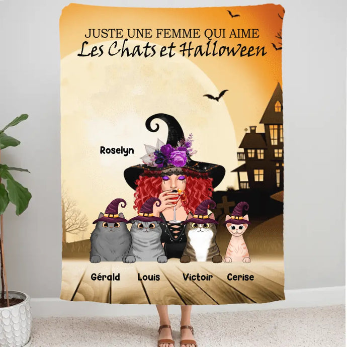 Couverture personnalisée, Plaid en polaire Cadeau pour Maman Chat, sorcière, Jusqu'à 6 Chats, Joyeux Halloween