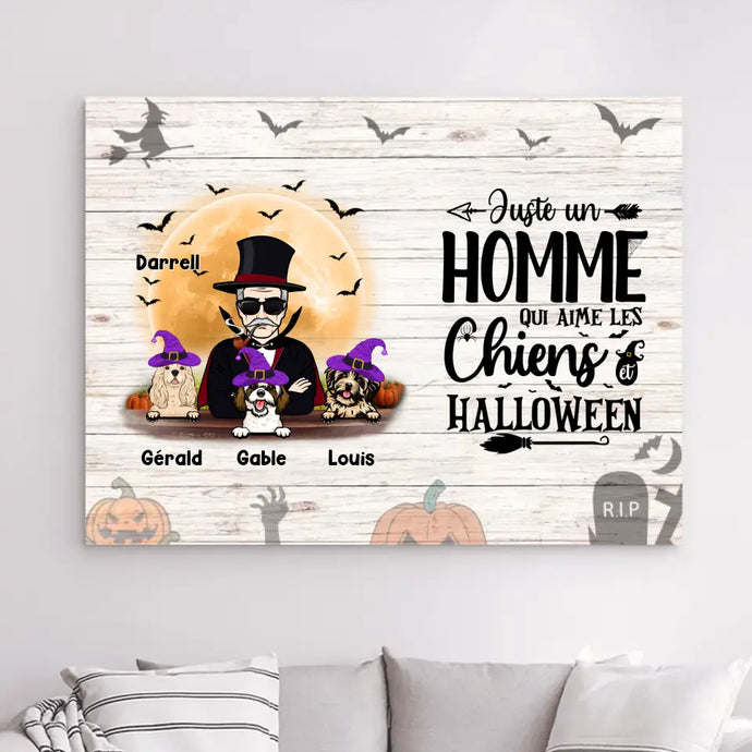 Toile à suspendre personnalisée, Toile cadeau pour Papa Chien, jusqu'à 6 chiens, Homme Aime Chiens et Halloween