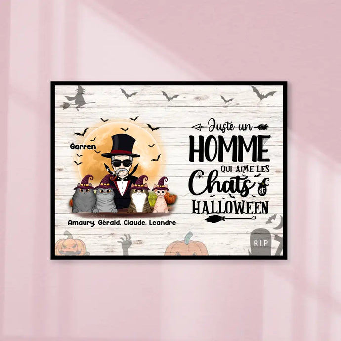 Poster encadré en bois personnalisée, Halloween cadeau pour Papa Chat, jusqu'à 5 chats, Homme Aime Chats et Halloween