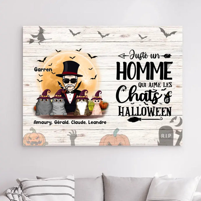 Toile à suspendre personnalisée, Toile cadeau pour Papa Chat, jusqu'à 5 chats, Homme Aime Chats et Halloween